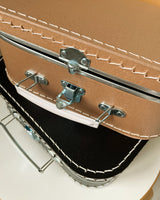 This cardboard suitcase come with cream coloured thread overstitching, and with a metal lining protecting the edges.