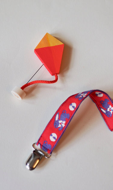 The Pacifier Clips are handmade from vintage ribbon and fabrics. They come with a metal clip, and elastic band to attach the pacifier to the string. Explore our matching pacifiers here.