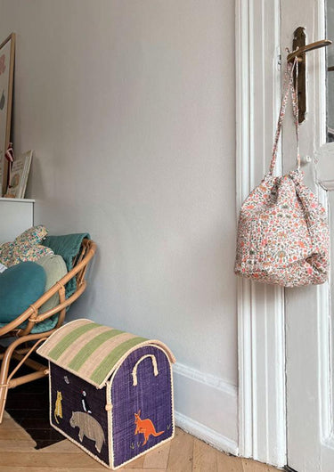 Pretty colours, a practical lid (the roof of the house), and wonderful, embroidered details make this storage basket suitable to place anywhere in the house.