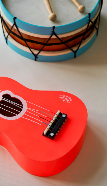 This colourful, classic drum is made from wood and real skin, and comes with two wooden drum sticks. The drum is ready to be carried around and may be played on, on both sides.