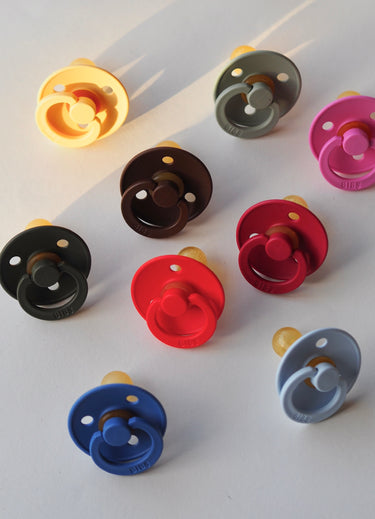Matching our handmade pacifier clips, these 100% natural rubber latex pacifiers come in a variety of beautiful colours.