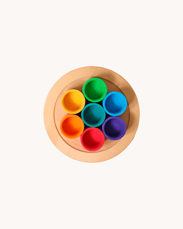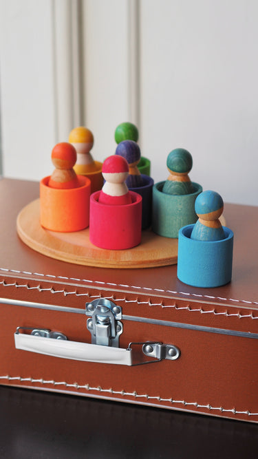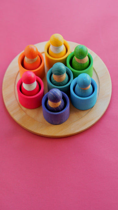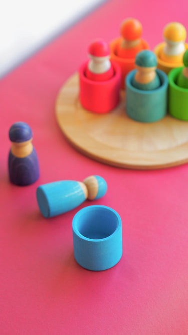 Young children enjoy taking the seven friends out of their wooden cups, turning the cups over, stacking them on top of each other and putting the little figures back again.