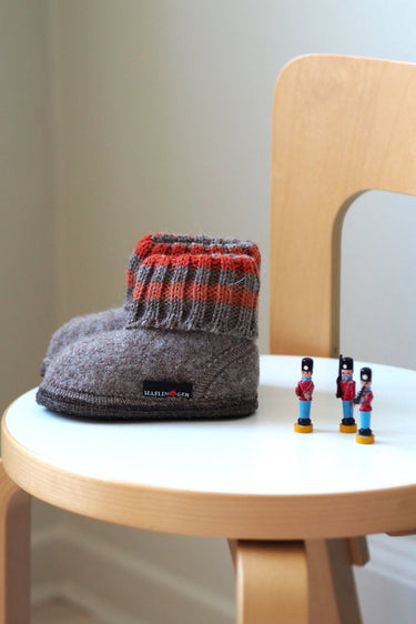 The Wool Shoe is a wonderful indoor shoe that comes with a sock-like top, that keeps your child warm and comfortable. The "sock" ensures that the shoe stays on the foot, but it is fully bendable and flexible and with no hard edges that may rub into the lower ankle as your child bends or sits downs.