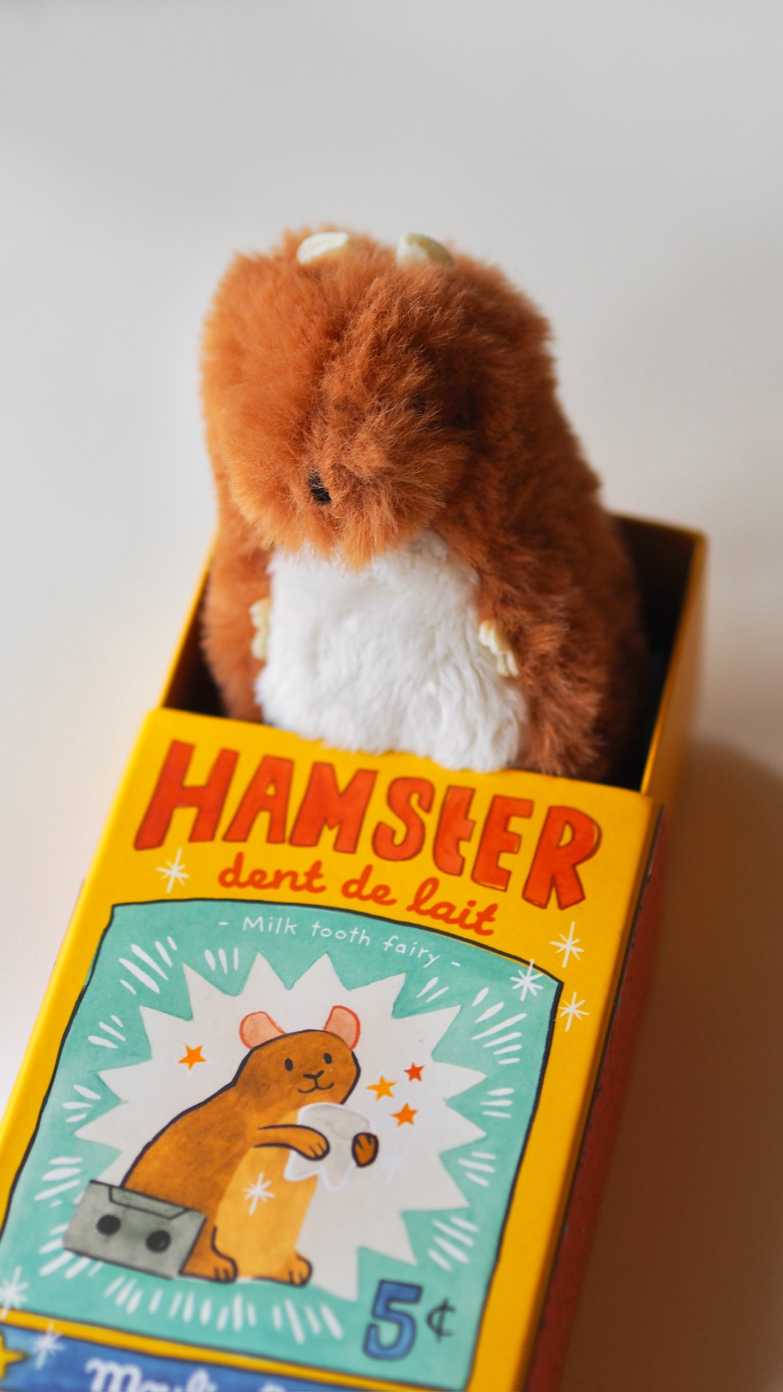 A very cute and very soft little hamster, that comes with a pocket to store your child's teeth until the tooth fairy arrives.