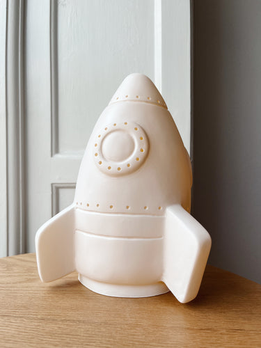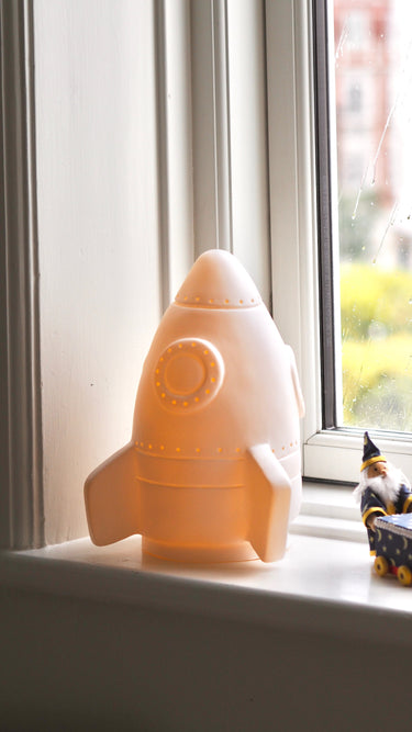 En sød rumraket-lampe, der giver et varmt og blødt lys.