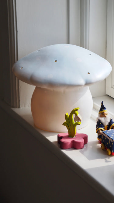 Denne skønne børnelampe er designet som en svamp, og er en humoristisk, dekorativ lampe til børneværelset. De små huller i toppen af svampen gør, at lyset skinner igennem i delikate lysstrømme og giver en hyggelig og rolig stemning.