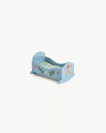 Vug de små dyr eller dukker i søvn i denne smukt illustrerede trævugge med tilhørende ternet madras.