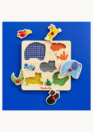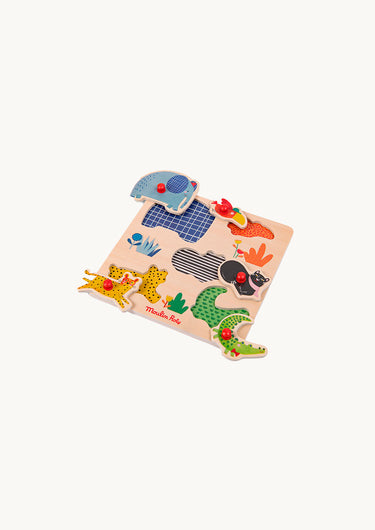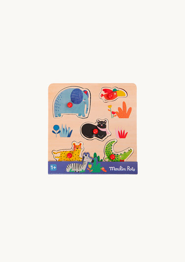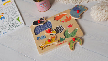Et skønt puslespil i træ for de mindste. Puslespillet består af 5 store farverige brikker, der hver har sin plads i brættet. På den måde hjælper puslespillet til med at lære din baby om størrelse, form og farver.