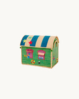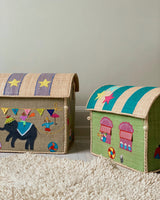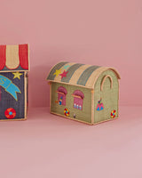 De smukke farver, det praktisk låg (husets tag) og de vidunderlige broderede detaljer gør kurven velegnet til at placere hvor som helst i hjemmet. Alle Raffia opbevaringshuse er håndlavet, og derfor er der ikke to der er ens.