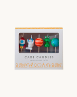 Et sæt indeholder 5 stearinlys på pind – lige til at stikke i lagkagen. Sætter her består af 5 stearinlys, inklusiv et rumskib, en atronaut, en alien og to planeter.